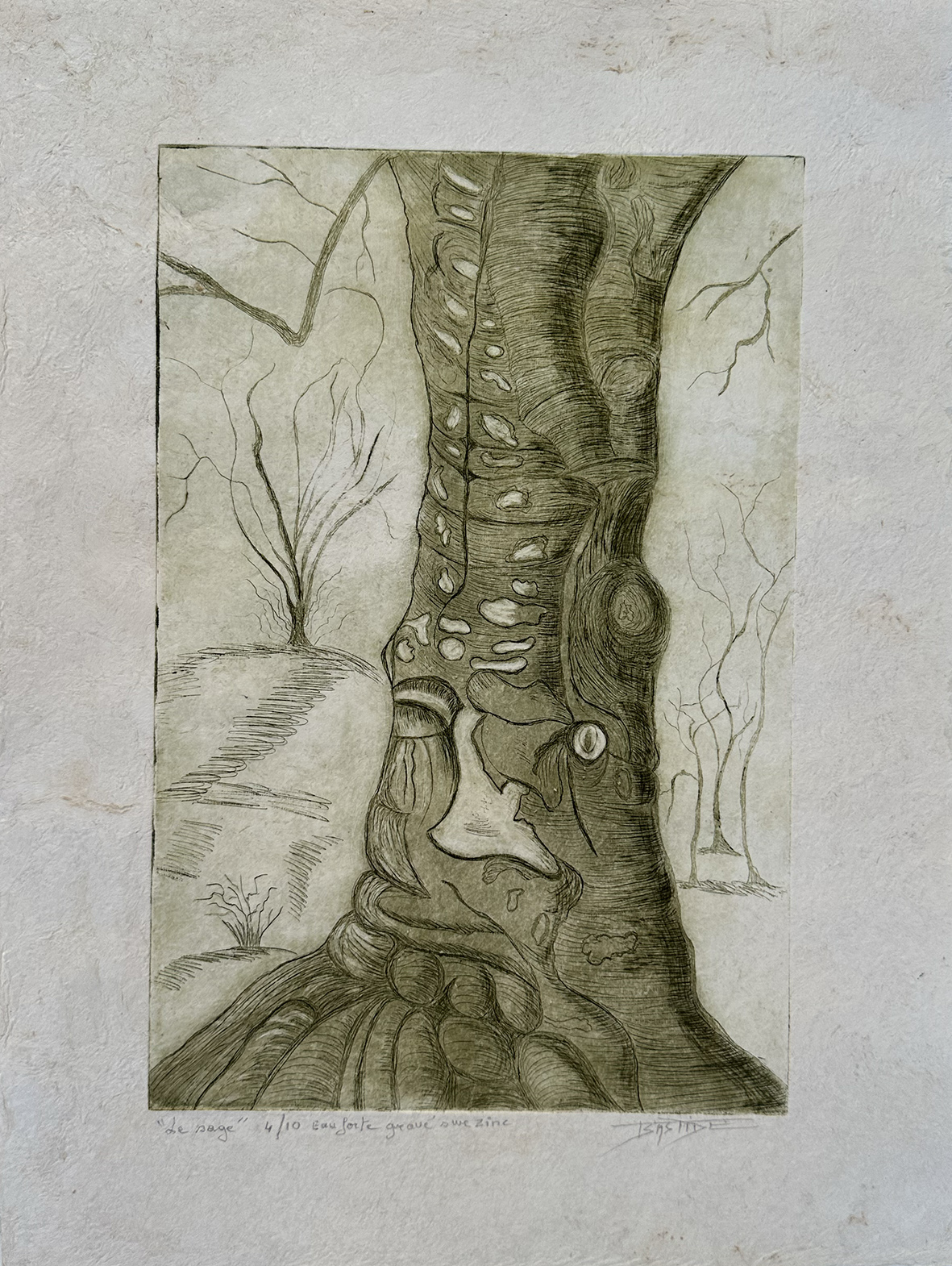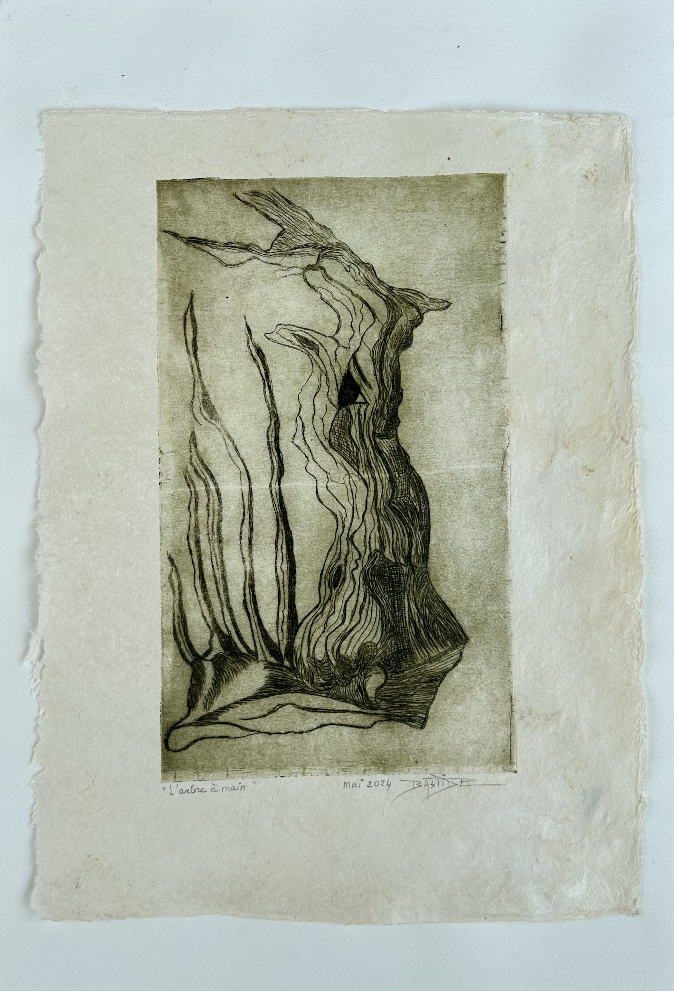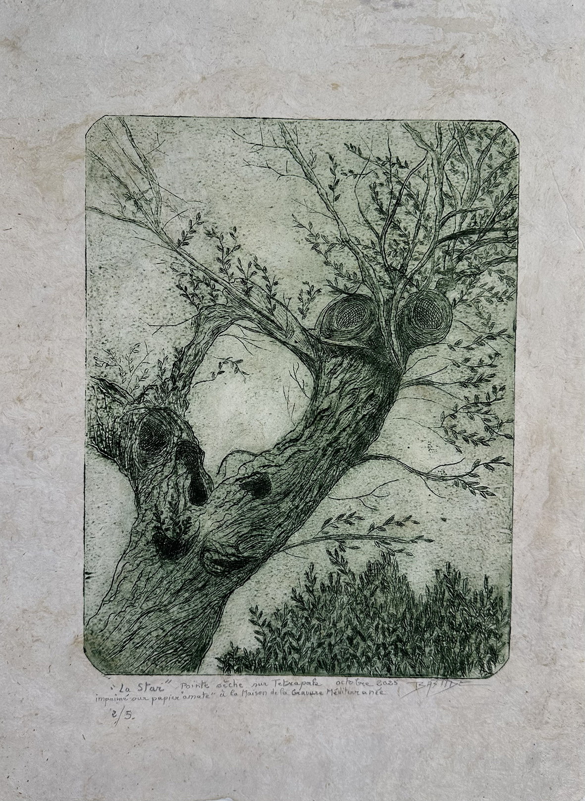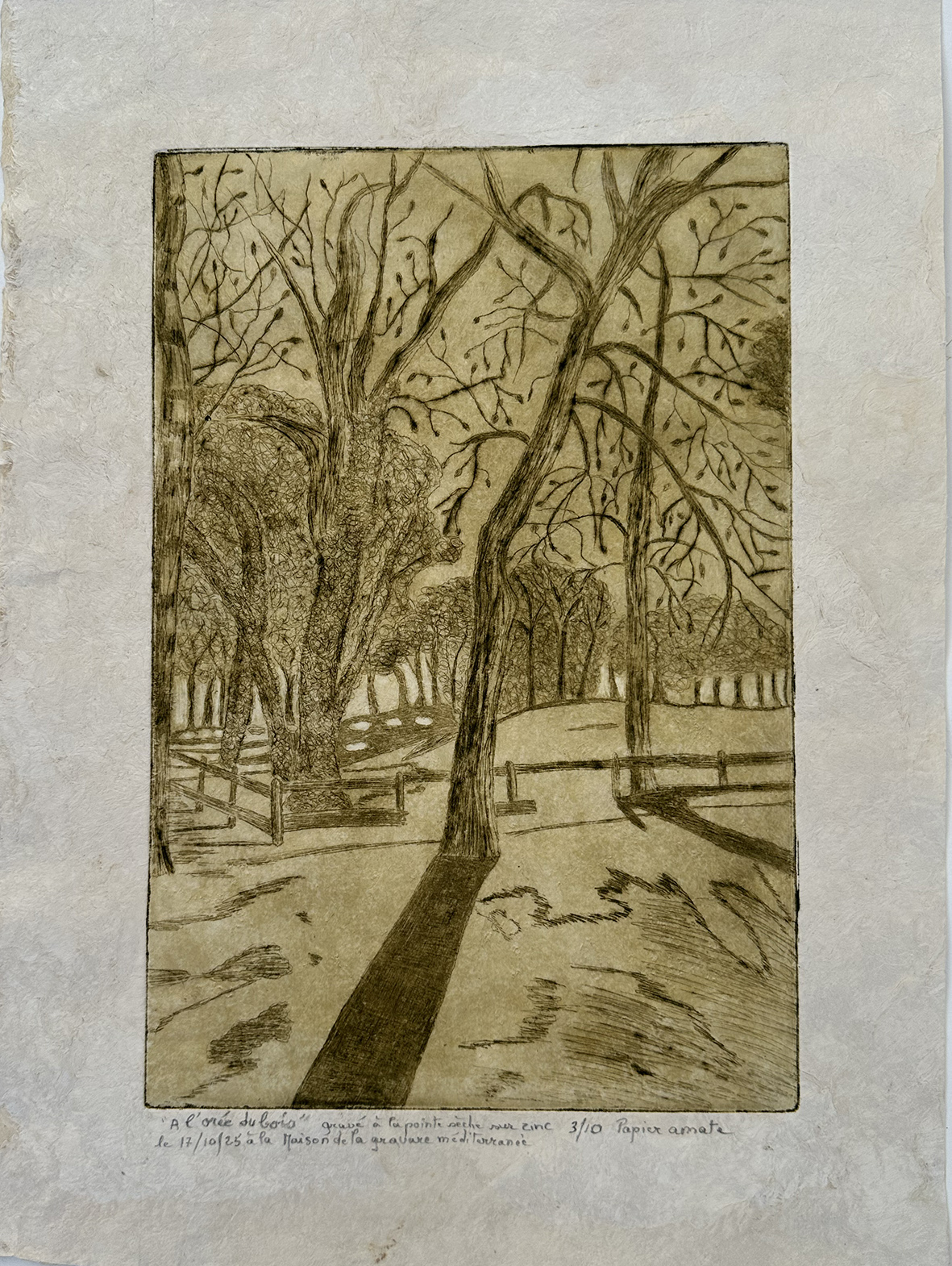 - Toutes les estampes qui suivent font 30cm sur 20cm gravées à la pointe sèche soit sur tetrapack soit sur zinc et imprimées sur « amate »