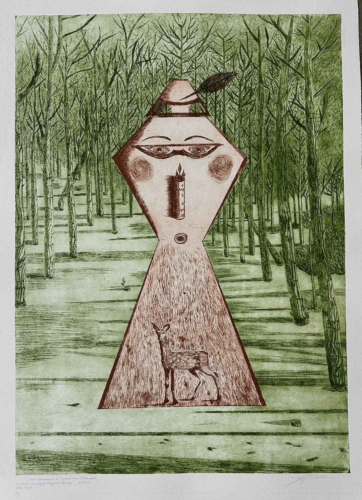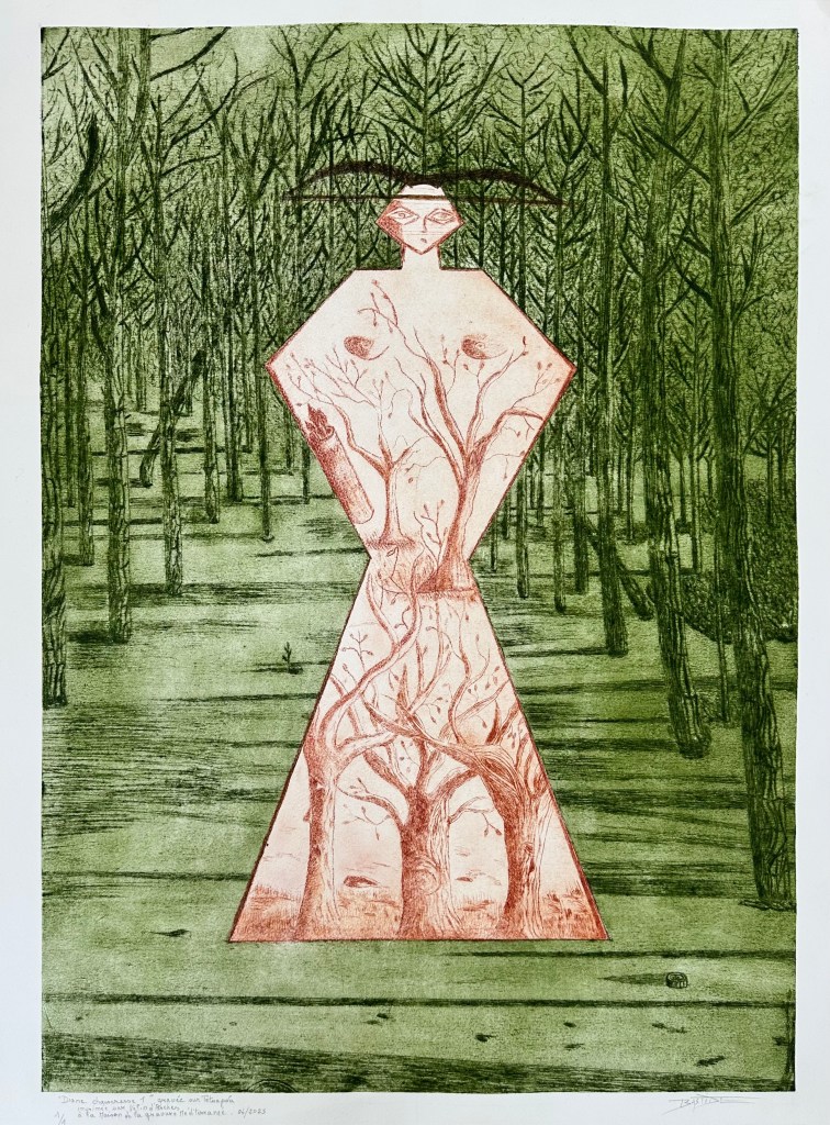 J’ai souhaité donner une place prépondérante à la légende de Diane Chasseresse qui vit dans les forêts. J’en ai réalisé deux versions gravées sur tetrapack